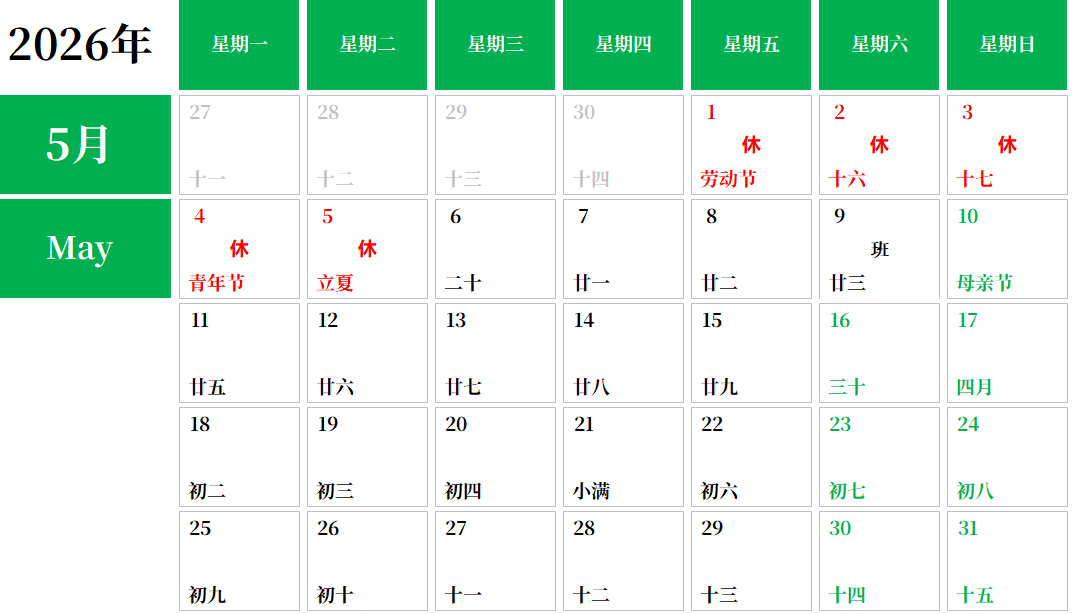 ●放假:5月1日(周五)~5月5日(周二) 5天休息
